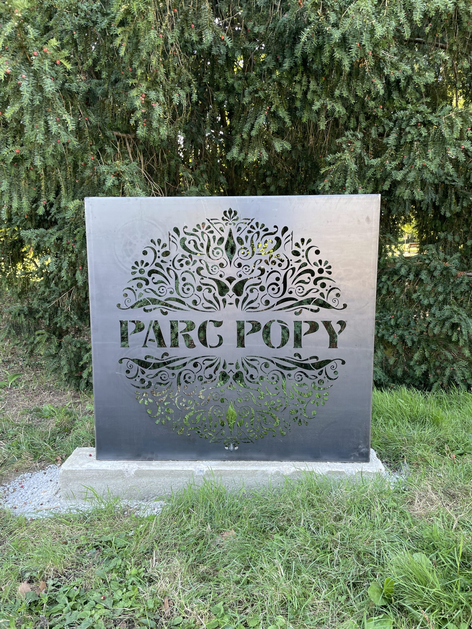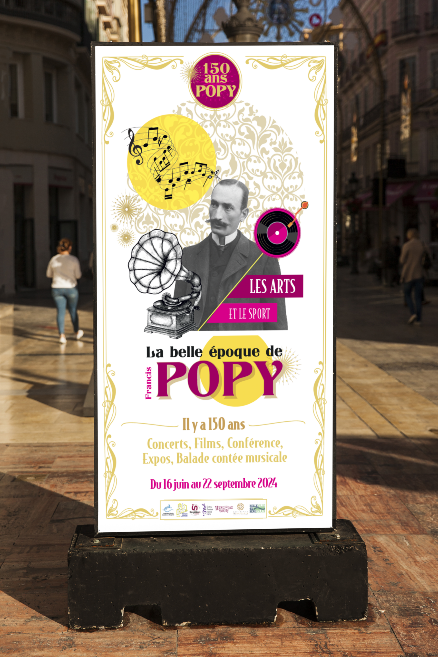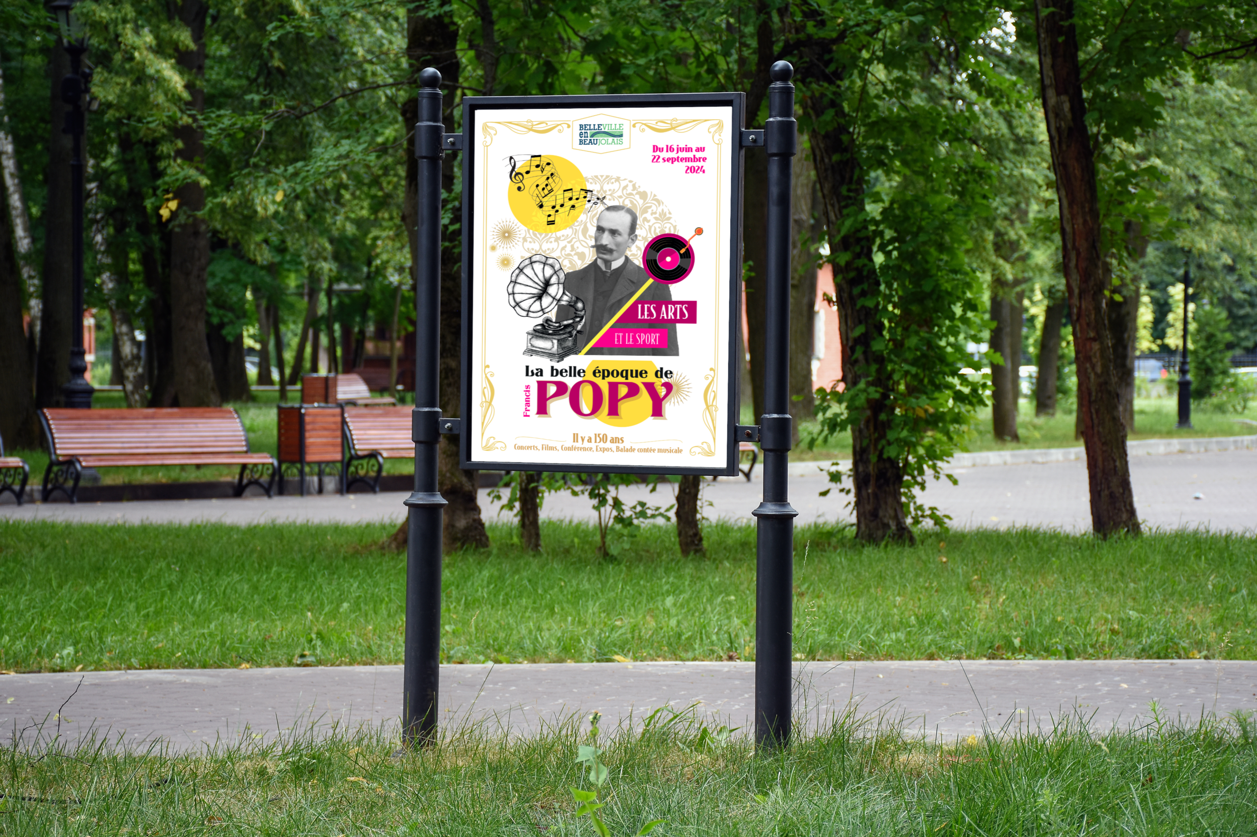 Création de l’identité visuelle pour le temps fort des 150 ans de la naissance du compositeur Francis Popy. Affiche, dépliant de programmation, affiche grand format et panneau d’entrée de parc en Corten . 2024