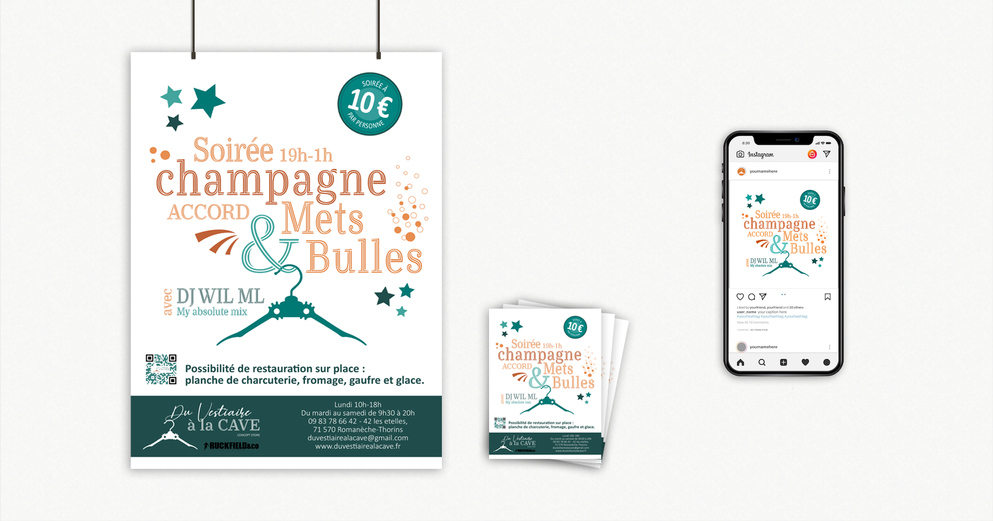Création de l’identité de marque du concept store « Du vestiaire à la cave ». Logotype, charte graphique, affiches, flyers, shooting photos. 2021